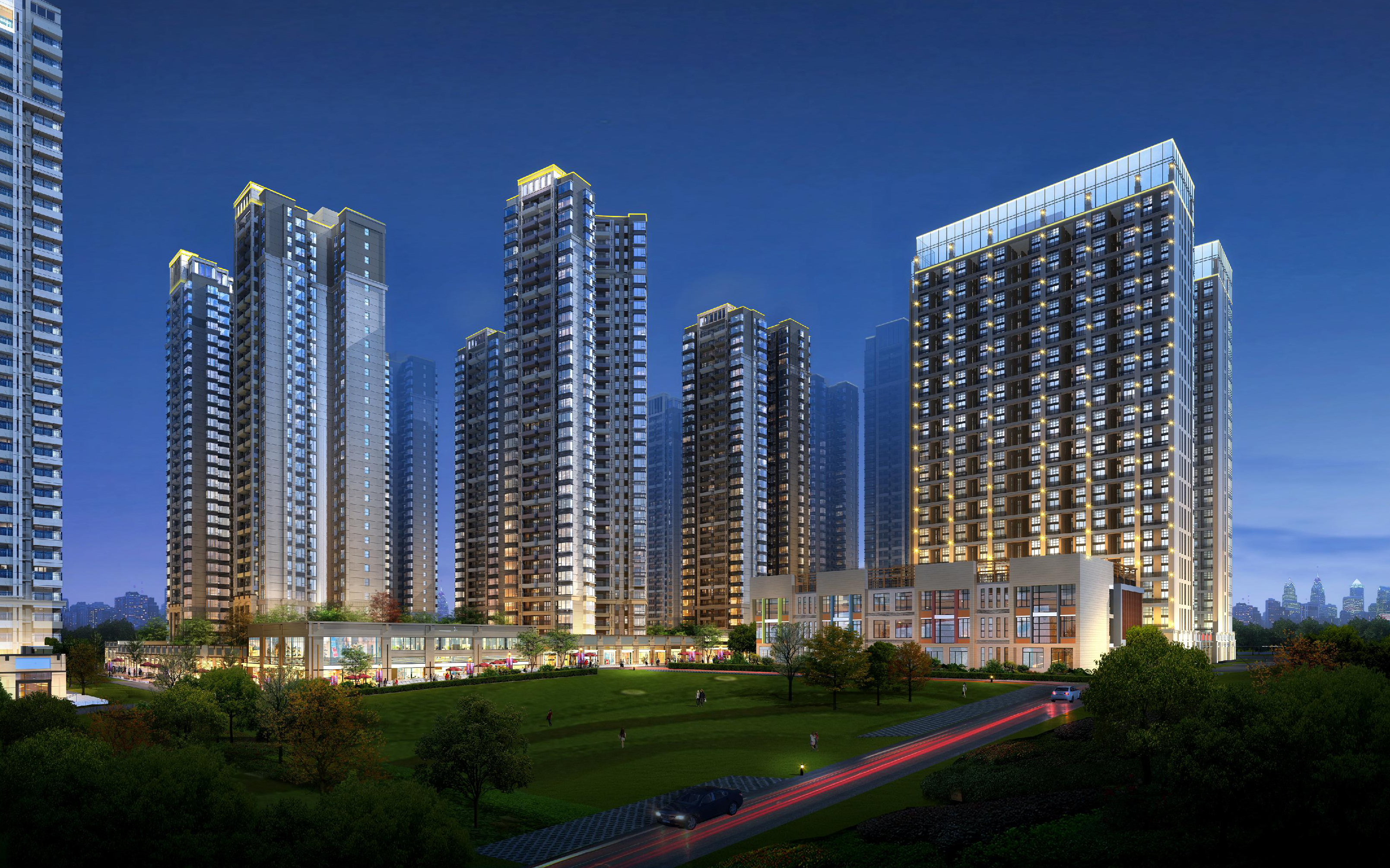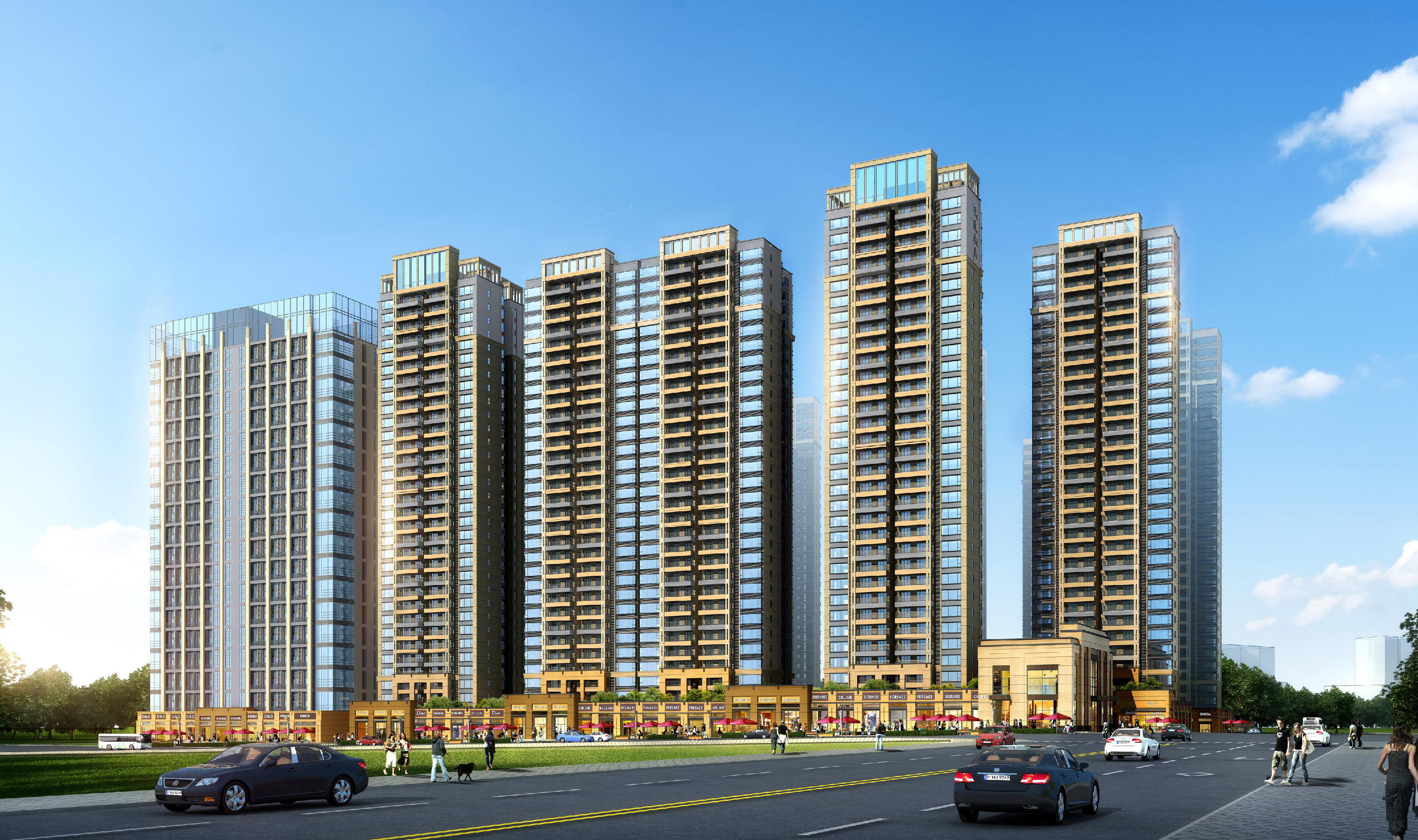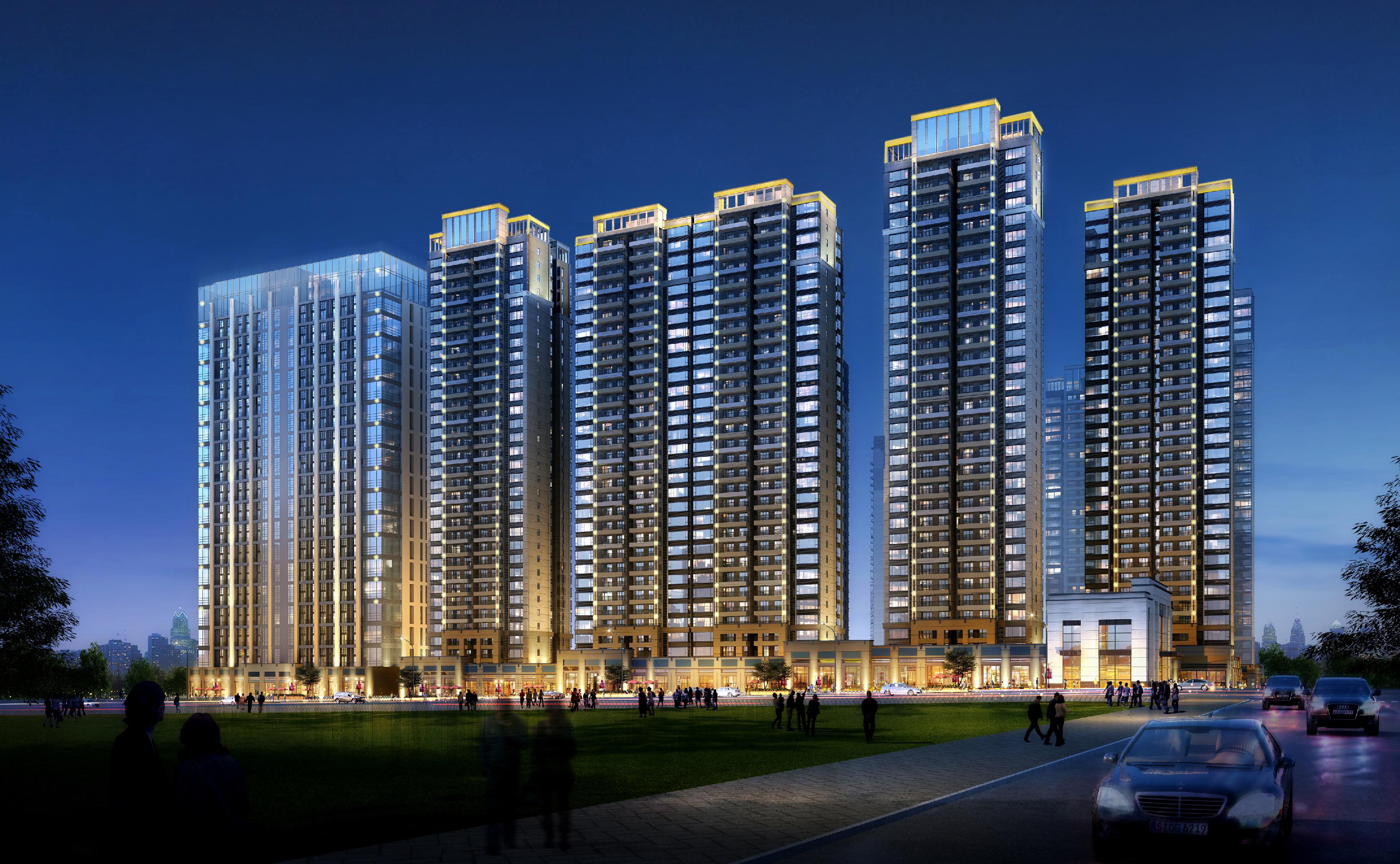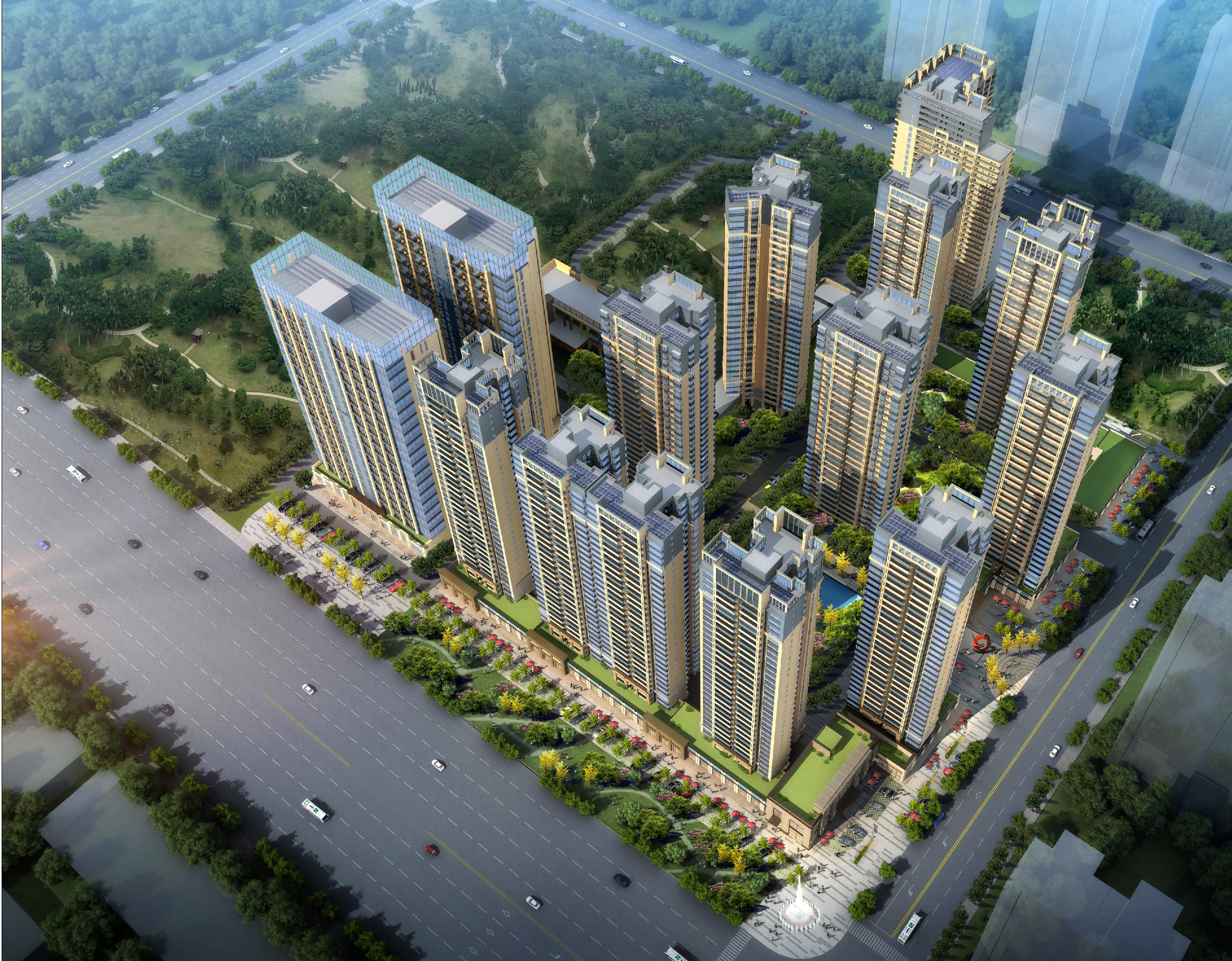 該項(xiàng)目布置為1棟29層、1棟30層、3棟31層、3棟32層、3棟33層住宅樓、2棟高層商業(yè)樓,建筑呈圍合式布置。